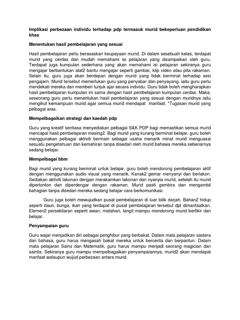 Implikasi Perbezaan Individu Terhadap Pdp Termasuk Murid Bekeperluan Pendidikan Khas Pdf